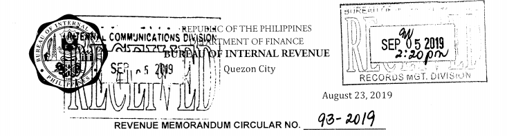RMC No. 93-2019 Posted on September 16, 2019September 16, 2019 by Adelerisa Mae Castro Amends the answer to question no. 2 of Revenue Memorandum Circular No. 85-2018 relative to the issuance of Electronic Certificate Authorizing Registration in the transfer of real properties RMC-No-93-2019Download Source of Info: https://www.bir.gov.ph Post Views: 1,829