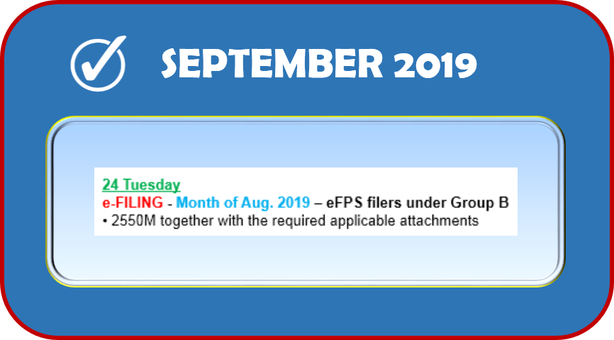 BIR TAX DEADLINE REMINDER Posted on September 24, 2019September 24, 2019 by Adelerisa Mae Castro September 24, 2019, Tuesday e-FILING – Month of Aug. 2019 – eFPS filers under Group B• 2550M together with the required applicable attachments Source of Info: https://www.facebook.com/birgovph/ Post Views: 1,470